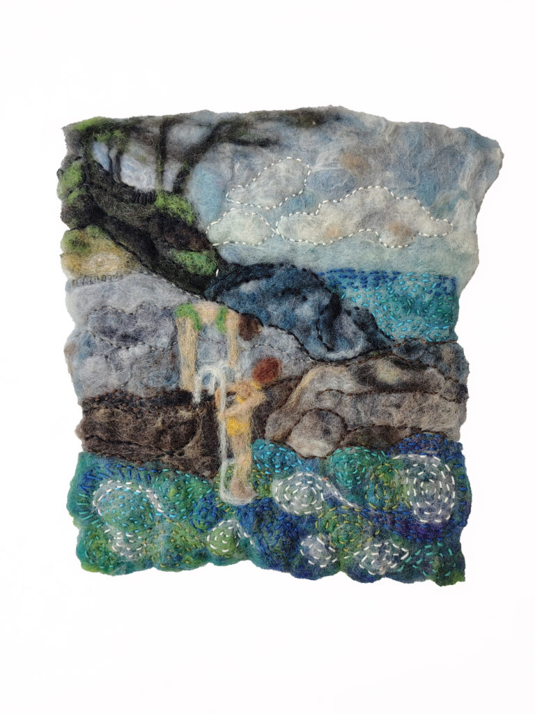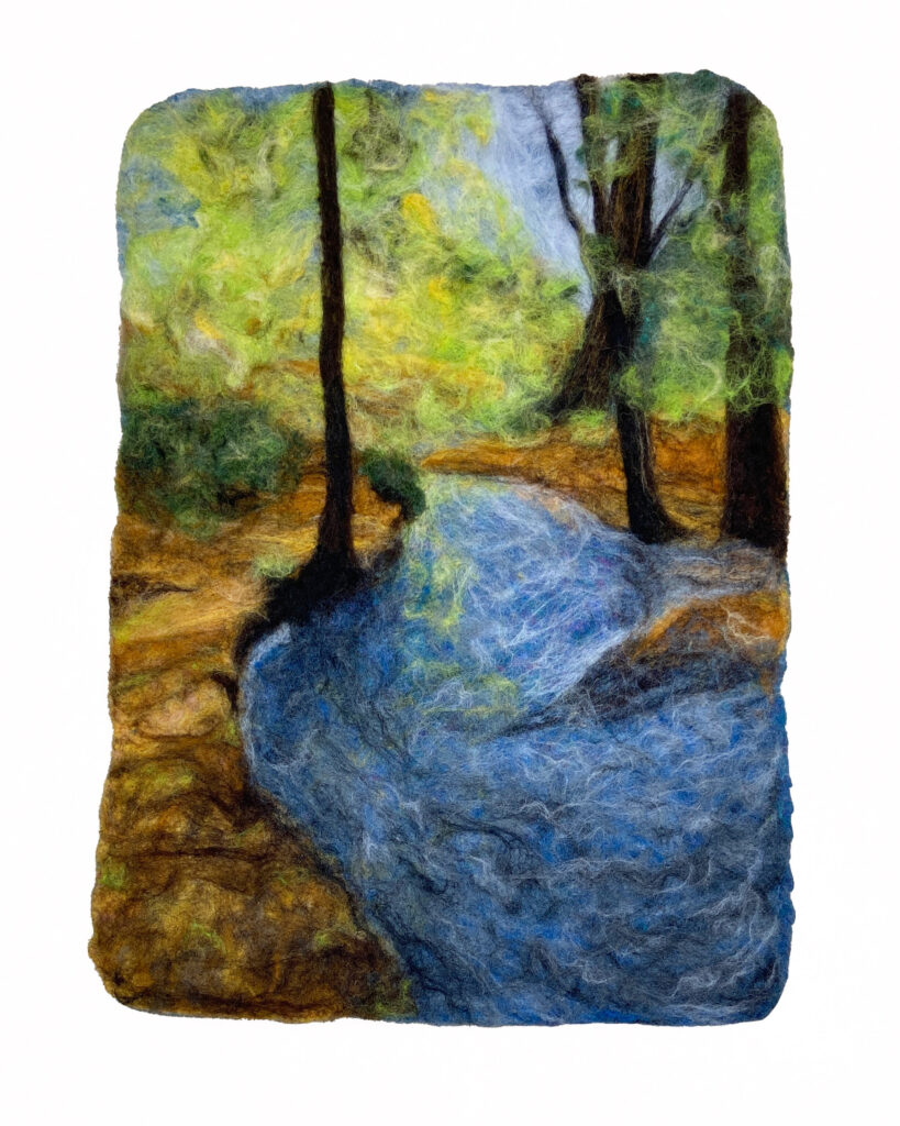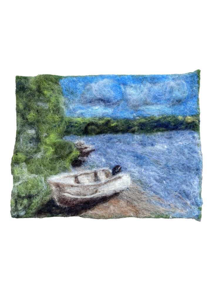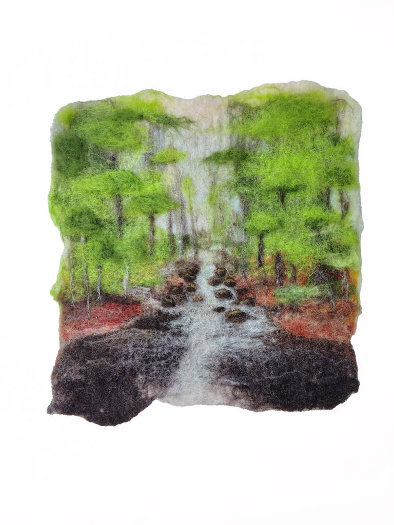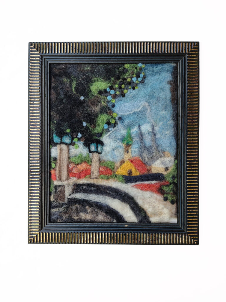 I create scenic paintings, figurines and accessories with wool using a mix of needle and wet felting techniques. Since I was a kid, I’ve had a passion for fibre arts—sewing, knitting, screen printing on fabric etc… I love discovering new processes and applying my craft in new ways such as, I dabble in costumes for dance performances and short film as well as fabric-based set pieces. A few years ago when I discovered felting, I became immediately hooked. It merges more classic visual arts–painting and sculpture with the tactileness of crafting.