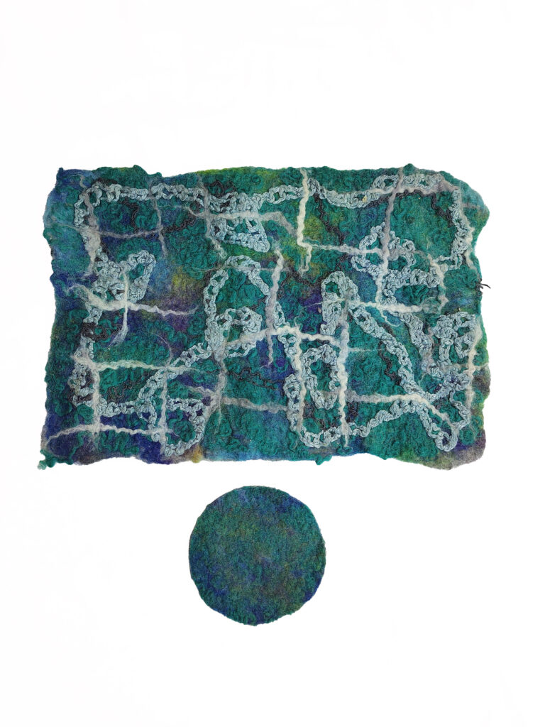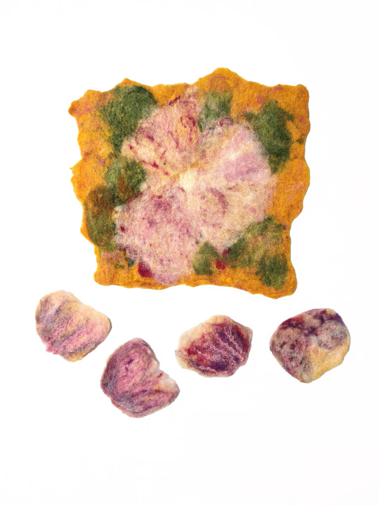 Je crée des peintures scéniques, des figurines et accessoires avec de la laine en utilisant un mélange de techniques de feutrage à l’aiguille et de feutrage humide. Depuis mon enfance, je suis passionnée par les arts de la fibre – couture, tricot, sérigraphie sur tissu, etc. J’aime découvrir de nouveaux procédés pour ensuite les intégrer à mon art, par exemple en créant des costumes pour des spectacles de danse et des courts métrages, ainsi que des éléments de décor en tissu. Il y a quelques années, lorsque j’ai découvert le feutrage, je suis devenue immédiatement accro. Je fusionne les arts visuels classiques – la peinture et la sculpture – avec l’aspect tactile de l’artisanat.